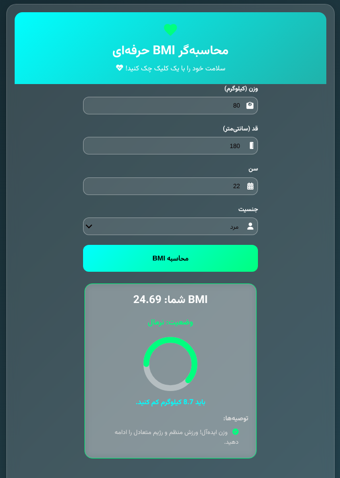 BMI CalculatorBMI calculator built with React: weight/height input, color-coded status, and suggestions.React JSHTMLCSSJavaScriptDemoGitHub
