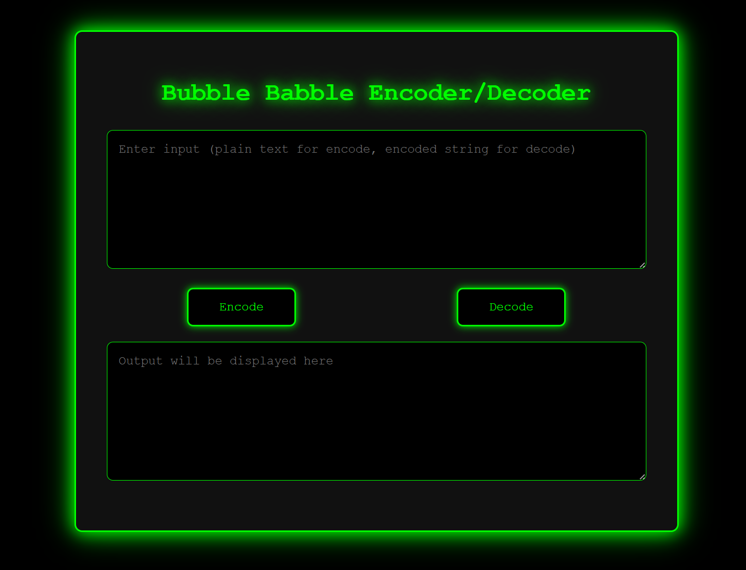 Bubble Babble Encoder DecoderBubble Babble encryption tool in JS: cyberpunk green-black hacker-style interface.JavaScriptHTMLCSSDemoGitHub
